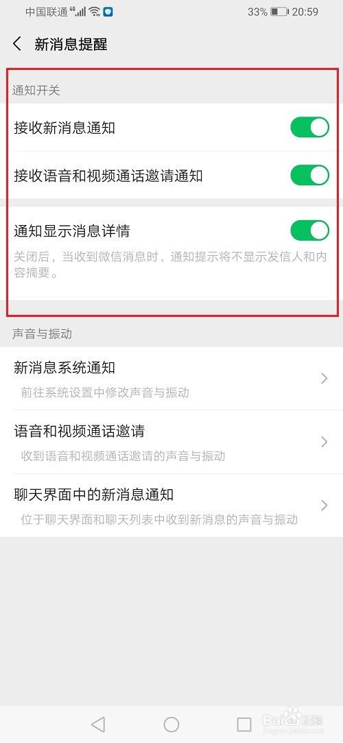 第一步打开微信,进去新消息提醒设置界面,开启所有通知
