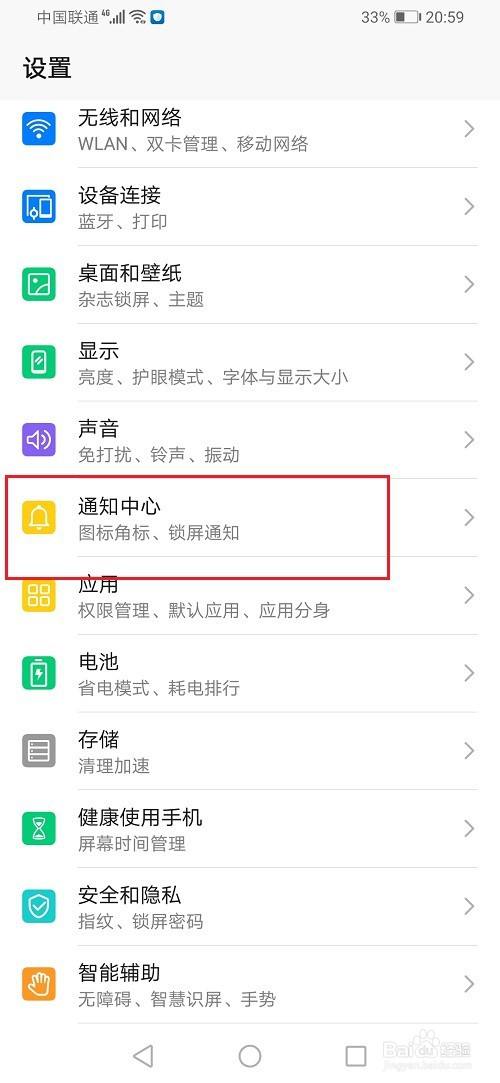 第三步在华为荣耀手机设置中,点击通知中心