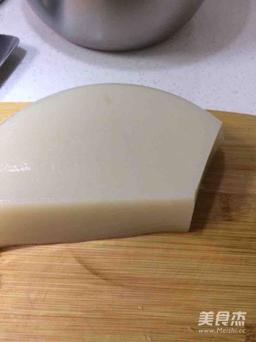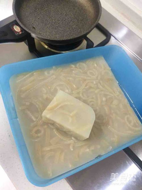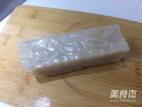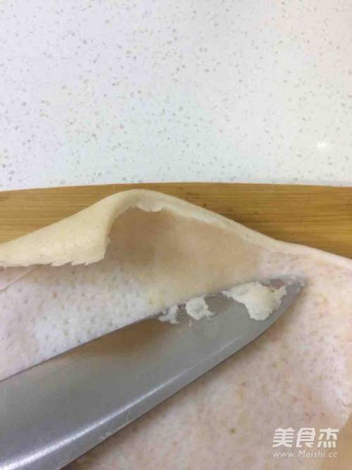 3将洗净的肉皮放在菜板上,用刀刮去肉皮航的肥肉,这样清冻会透亮清澈,而且肉皮会更劲道Q弹