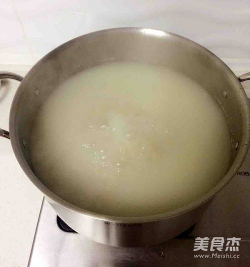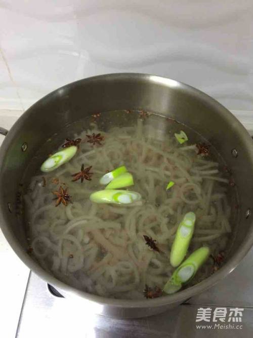 7锅中盛满清水,将肉皮倒入锅中,开大火,煮沸,锅中放入花椒,大料,料酒,姜片,撇去浮沫,调至中火煮至汤汁出胶状