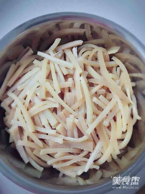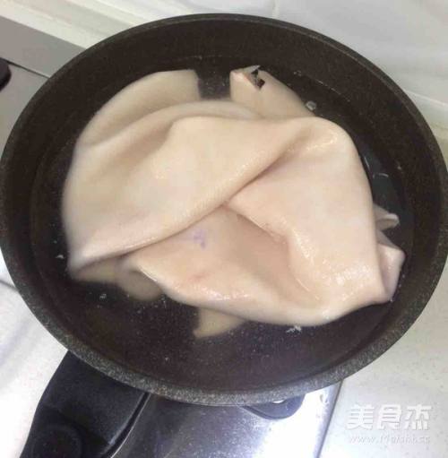 2焯水,冷水下锅,锅中倒入少量料酒,焯出油脂浮沫,水开后捞出肉皮洗净