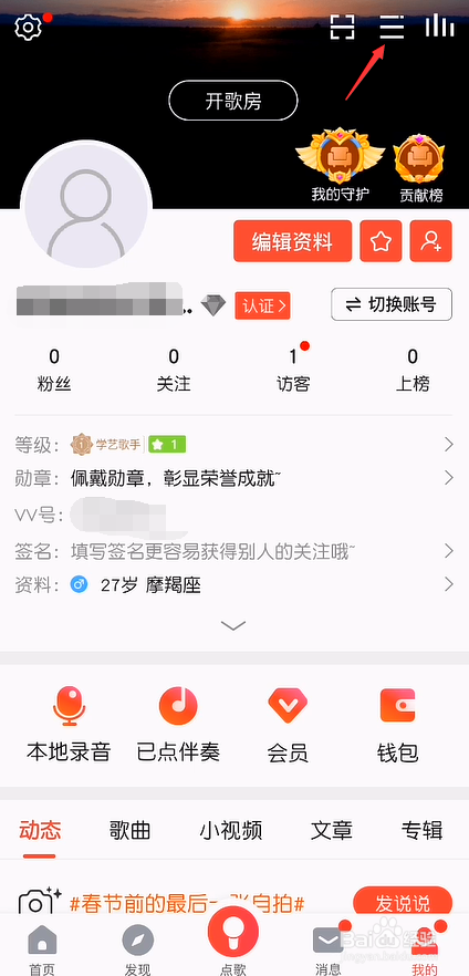 进入我的页面,点击顶部三图标。
