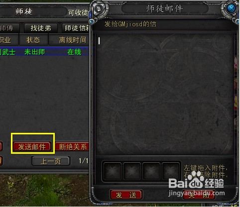 师徒之间可以通过邮件发送未绑定的物品,师傅向每个徒弟发送邮件的次数为每周最多七次,徒弟向师傅发送邮件次数也为每周最多七次。