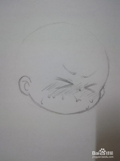 在圆的边边上修出人物头型和脸型轮廓,然后再画出人物的五官,最后画出脸上的红晕和汗水。