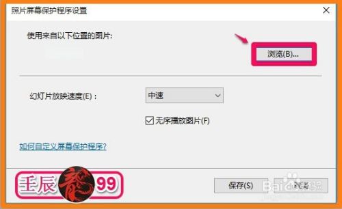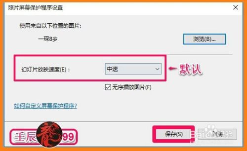 回到照片屏幕保护程序设置对话框,我们默认幻灯片放映速度为中速,再点击:保存(S);