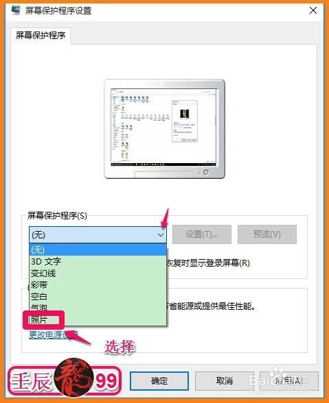 点击屏幕保护程序(S)栏中的小勾,在下拉菜单中选择“照片”;