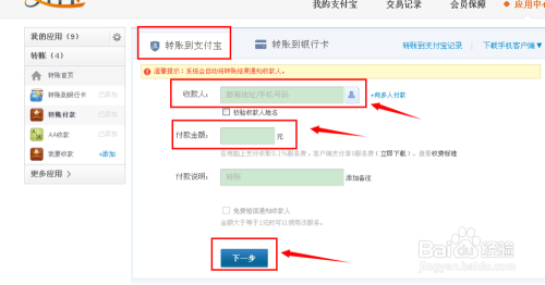 之后,输入“收款人支付宝账户“、”转账金额“,再点击”下一步“就可以。