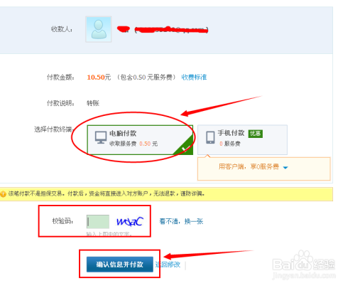 之后,就进入了确认付款信息的界面。选择”电脑付款“,输入”验证码“,再点击”确认信息并付款“