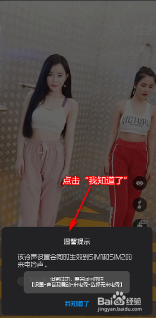 点击“设为来电秀"双卡提示你设置会同时应用SIM1和SIM2的来电铃声。点击“我知道了”即可。此时来电秀设置完成。