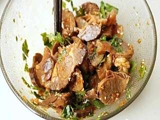 牛肉、生姜、大蒜、干辣椒、八角和清水倒入高压锅内,搅拌均匀,盖上盖子,打开开关,煮45分钟,捞出,切片,放入碗内,撒上香菜,淋上酱料,搅拌均匀。