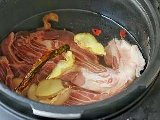 牛肉、生姜、大蒜、干辣椒、八角和清水倒入高压锅内,搅拌均匀。