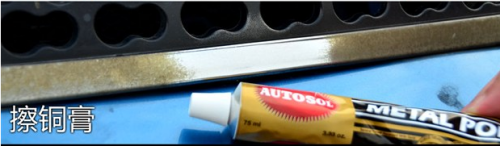 分别使用牙膏、洁厕灵、擦铜膏涂在镀铬装饰条上,用毛巾擦拭,可以对比一下效果,其中擦铜膏是效果最好的,其次是洁厕灵。