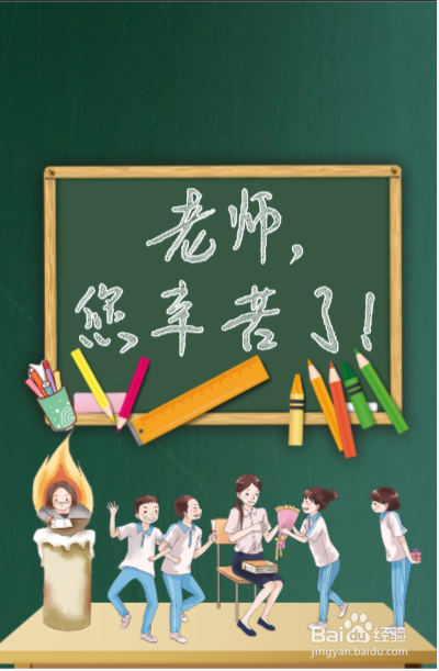 第四步,在卡纸中间位置,画上一个小黑板,黑板写上“老师,您辛苦了”