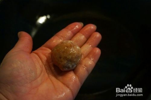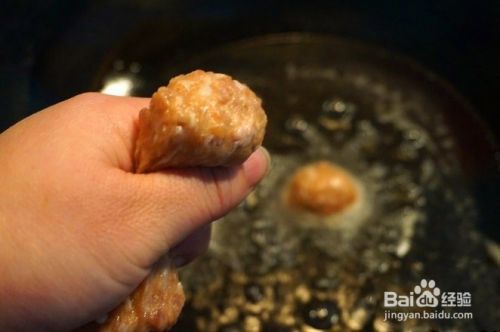 手上沾点凉水,捞一把肉馅,从虎口处挤出一个丸子来,入油锅中。