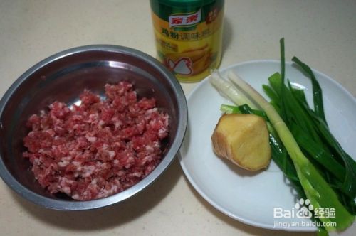 肥瘦三七成的猪肉馅、两棵小葱、两片姜准备好。