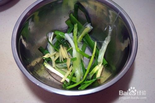 小葱撕成长条、姜切细丝,放适量的凉水。