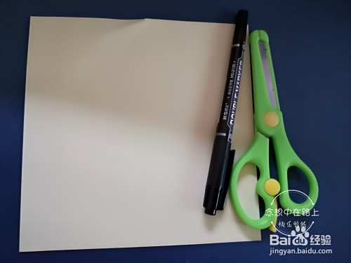 首先准备好一张正方形的彩色纸、一支笔和一把儿童剪刀。