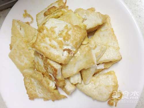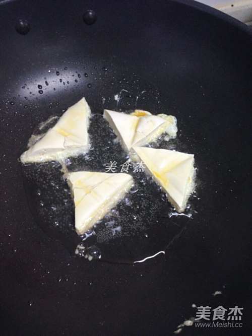 然后锅里倒入油,把粘上蛋液的豆腐放入锅里煎。