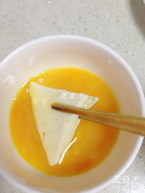 鸡蛋打在碗里加少许盐拌匀,用筷子把切好的豆腐夹在碗里粘上蛋液。