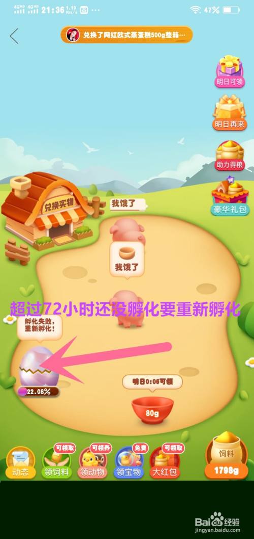 进入就弹出对话框孵化稀有动物1只,点击领取。如果72小时没有孵化成功就是失败要重新孵化。