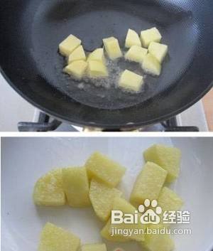 锅中略多些油,将切成块的土豆放入略煎至表皮收紧(这个步骤是我新学来的,可以使土豆口感绵软,味道更好)盛出备用。