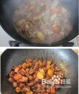 加入土豆板栗丁一起翻炒,倒入2碗水刚没过鸡腿板栗,放入桂皮八角香叶,调入一点点盐,2小勺糖,料酒,美极鲜酱油,一点点老抽上色,转小火煮至汤汁收干,再入少许鸡精提鲜,即可。
