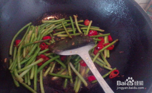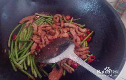 加入蒜苔翻炒2分钟,加入少许食用盐和白糖。