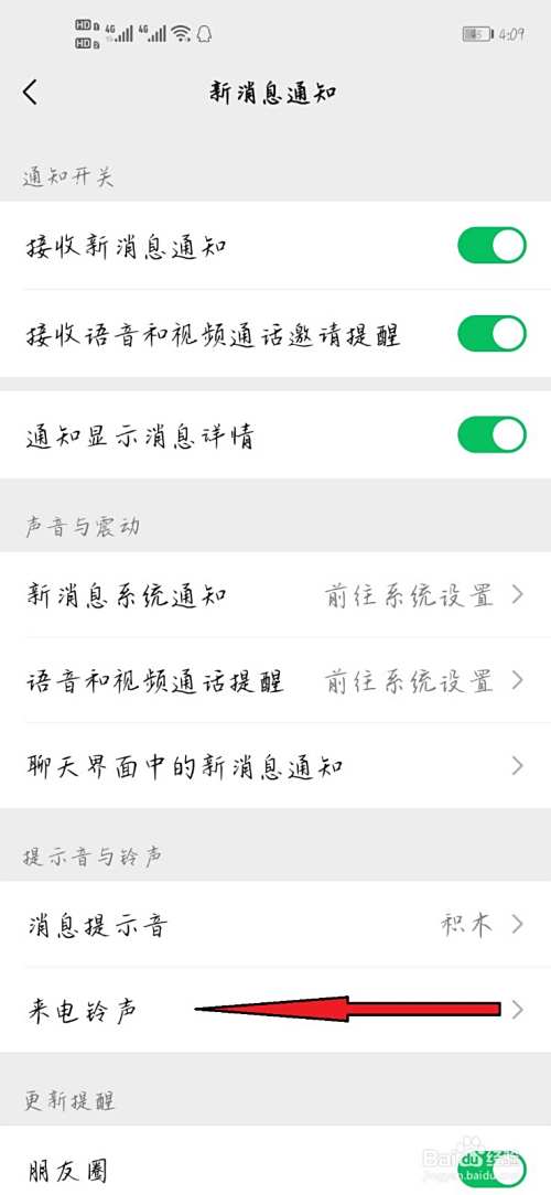 在【新消息通知】页面,点击进入【来电铃声】页面。