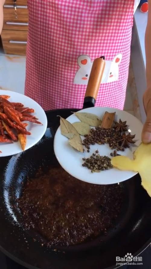 接下来起锅烧油,加入火锅底料,待炒出红油后加入姜片,八角,桂皮,香叶,花椒,干辣椒,将其炒香后加适量的水。