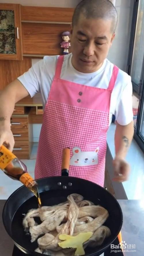 首先将清洗干净的猪大肠冷水下锅,放姜片和料酒,然后焯好水后捞出,再用清水洗净备用。