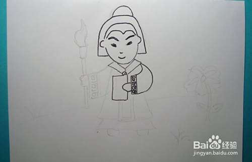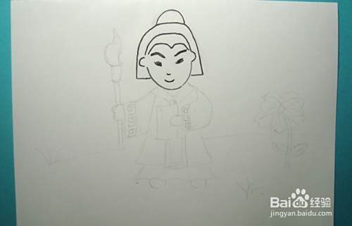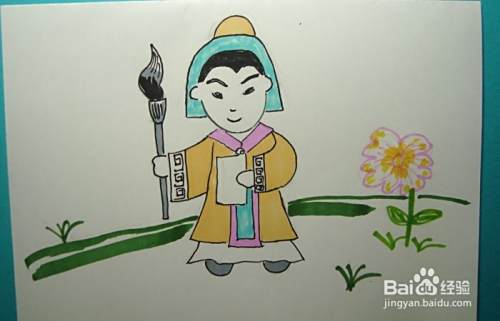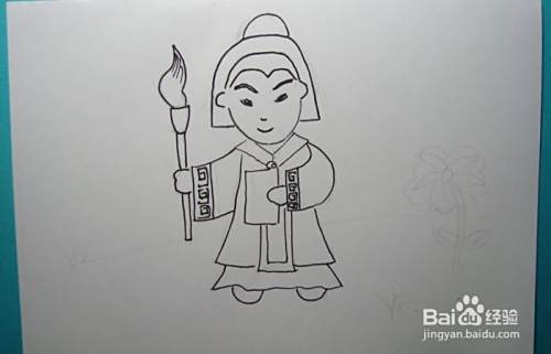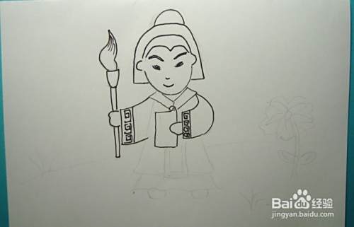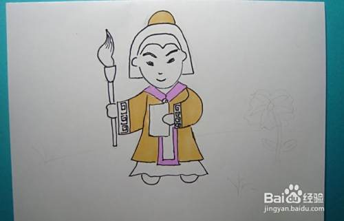 然后,用黑色彩色笔画出萧让的身体和右手的图形,并画出手上拿着的毛笔的图形,如下图所示。