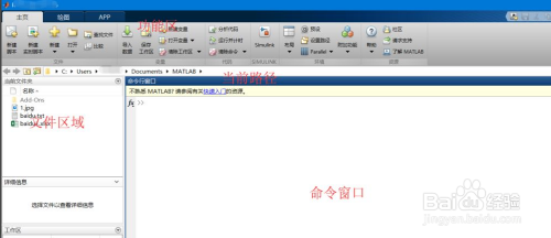 这是matlab打开之后的基本界面,上方为命令功能区,右侧为命令行输入栏,左上角为当前路径中文件夹详情,左下角为软件工作区。