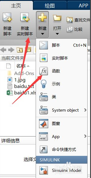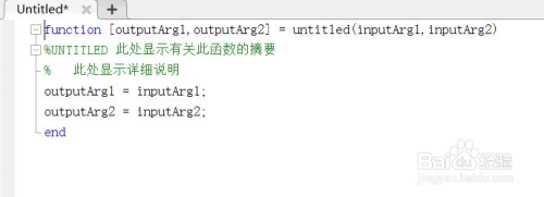 在软件左上角位置中的 点击 新建,之后即可新建脚本,函数等文件,这里选择文件,之后将会出现如图所示的函数的基本形式,function函数的基本形式,编辑完成后,只要将函数名输入到命令行中即可进行使用。