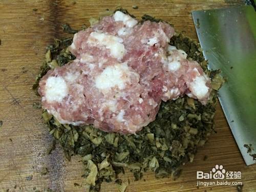 将步骤2的碎肉和步骤3的碎梅菜混合揉捏均匀,再剁一遍。