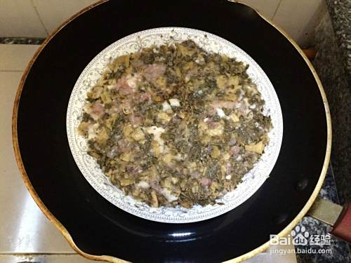 将混合好的梅菜猪肉放到碟子,加2-3滴酱油调味,再放到锅里用大火隔水蒸15分钟。