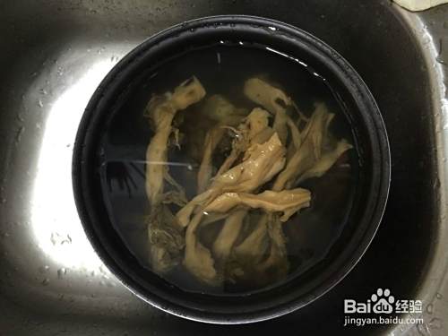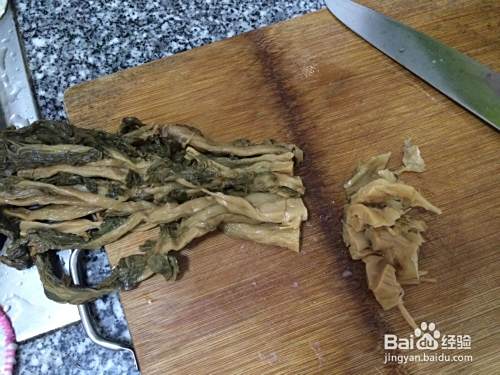 取出一包半斤重的梅菜,每一瓣撕开,切去头部。彻底洗一遍后,用清水浸泡1小时。待用。