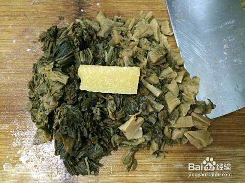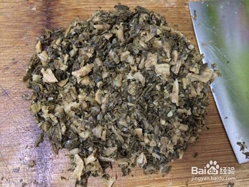 将浸泡好的梅菜取出,现切成小块,加入适量黄片糖,一起剁碎。