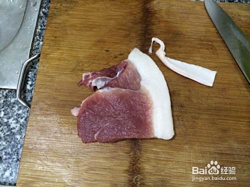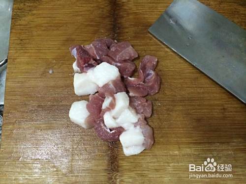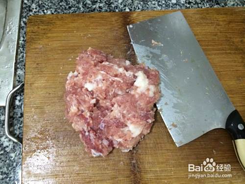 取出半斤半肥瘦肉,把猪皮去掉,现切成小块,然后用大刀剁碎。