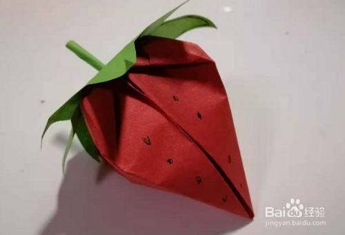 剪裁好之后,再用纸卷一个纸卷作为把,然后将叶子粘贴在草莓上就可以了,最后画点圆点装饰一下。