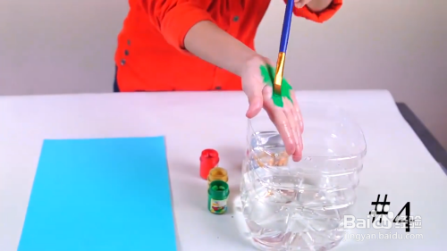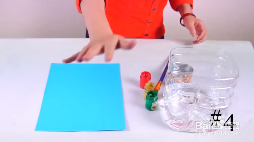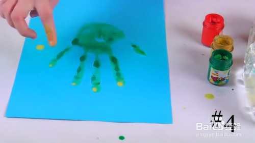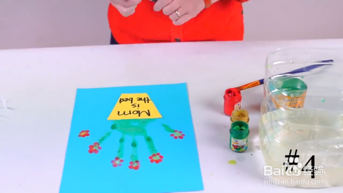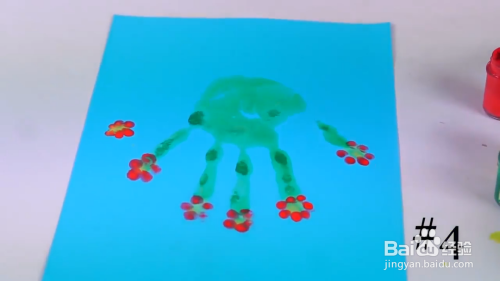 然后手沾水,涂抹颜料,并把手印在卡纸上。
