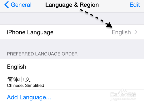 在 Language & Region 列表里,如果可以看到最近使用的“简体中文”的话,可以直接点击选择。如果没有的话,请点击 iPhone Language 一栏。