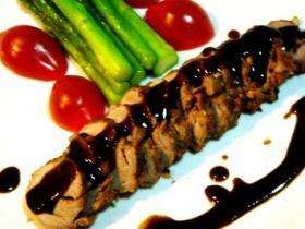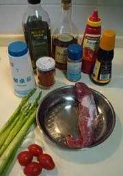 主菜:<br>嫩猪柳 250克<br>辣椒粉 适量<br>大蒜 15克<br>葱 20克<br>橄榄油 20ml<br>白兰地酒 25ml<br>番茄酱 20克<br>盐 3克<br>黑胡椒粉 2克<br>黑胡椒汁 20克<br>配菜:<br>鲜芦笋 200克<br>樱桃小番茄 4个