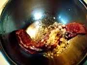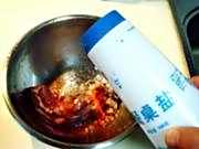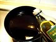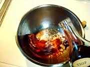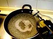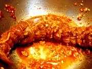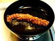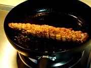 13油热后把捆扎好的猪柳放入锅中煎制。