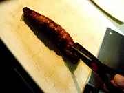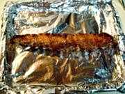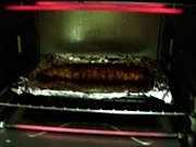19猪柳烤熟后从烤箱取出,趁热用剪刀剪开捆扎猪柳的线绳。