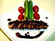 1主菜;嫩猪柳250克、辣椒粉适量、大蒜15克、葱20克、橄榄油20 ml、白兰地酒25ml、番茄酱20克、盐3克、黑胡椒粉2克、黑胡椒汁20克;配菜;鲜芦笋200克、樱桃小番茄4个。