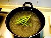 12油热后把捆扎好的猪柳放入锅中煎制。