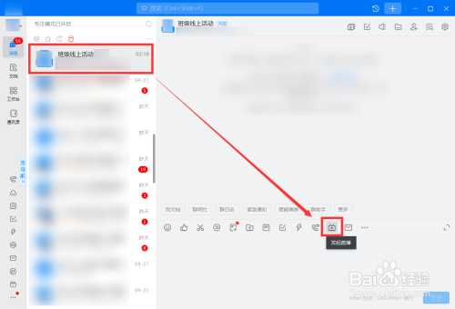 打开钉钉软件,在群列表中点击打开【班级活动群】,再点击右侧的【发起直播】。