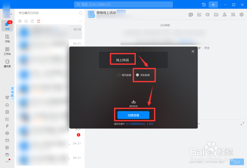 在弹窗中输入【活动主题】,勾选【课堂直播】,再点击【创建直播】。