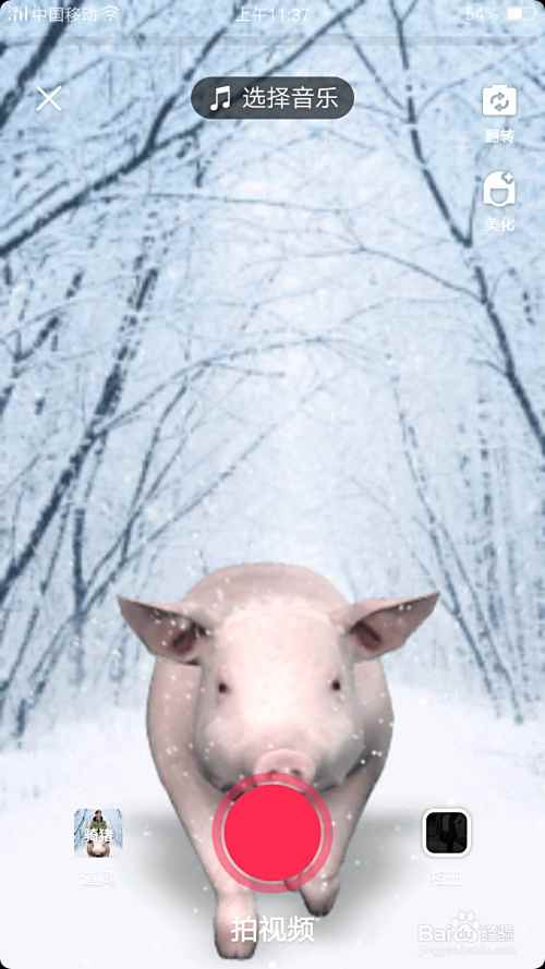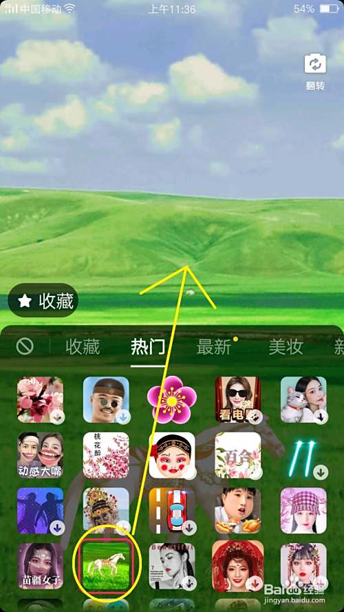 点选道具后,再点击 上面,就是预览界面,就能拍摄,或从手机里选现成的。如果要调用后置摄像头,就点击 右上角 翻转 图标