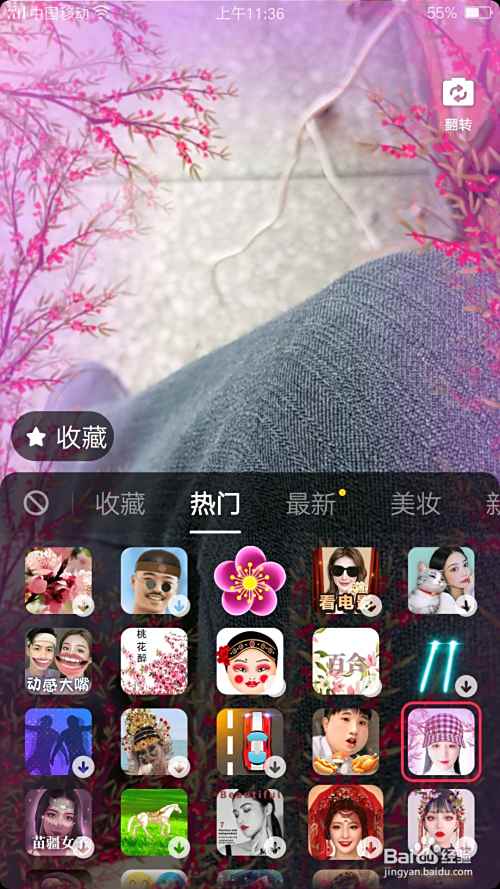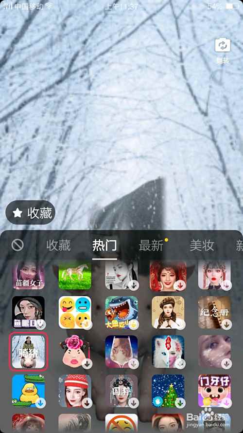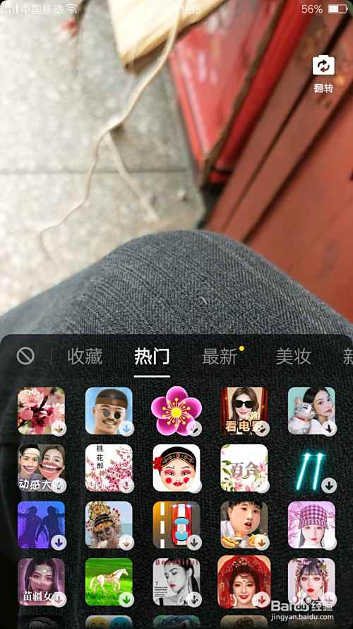 默认进入道具选择界面。这里有很多道具,其中有:热门 最新 美妆 …… 点击一个频道,就能看到此类别下的 道具